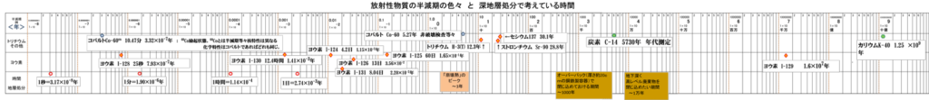 そして【今を起点にして 放射性物質の半減期のいろいろ(左はスタート時、右が未来】 も
