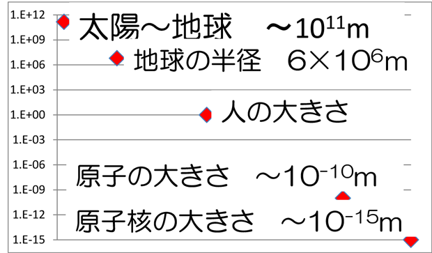 これは 縦方向が対数目盛の・・・【ミクロ(原子)とマクロ(宇宙)の大きさ(の棒グラフ?)】。